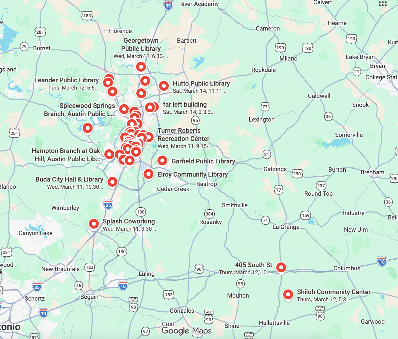 March 11-15, 2026 March 11-15, 2026 March 11-15, 2026 Find Free & Open Learning Experiences Near You! View fullsize Meet the Central Texas (CTX) Learning Festival!Wed, March 11–Sun, March 15th. Learning experiences free & open for all. Put on by the Central Texas community for the Central Texas community. Explore what you can learn through the 2026 CTX Learning Festival! See the schedule Click on the map to see where learning will take you during the 2026 Central Texas Learning Festival! Stay connected with CTX Learning Festival! on Instagram @ctx.learningfestival on Facebook @ctxlearningfestival